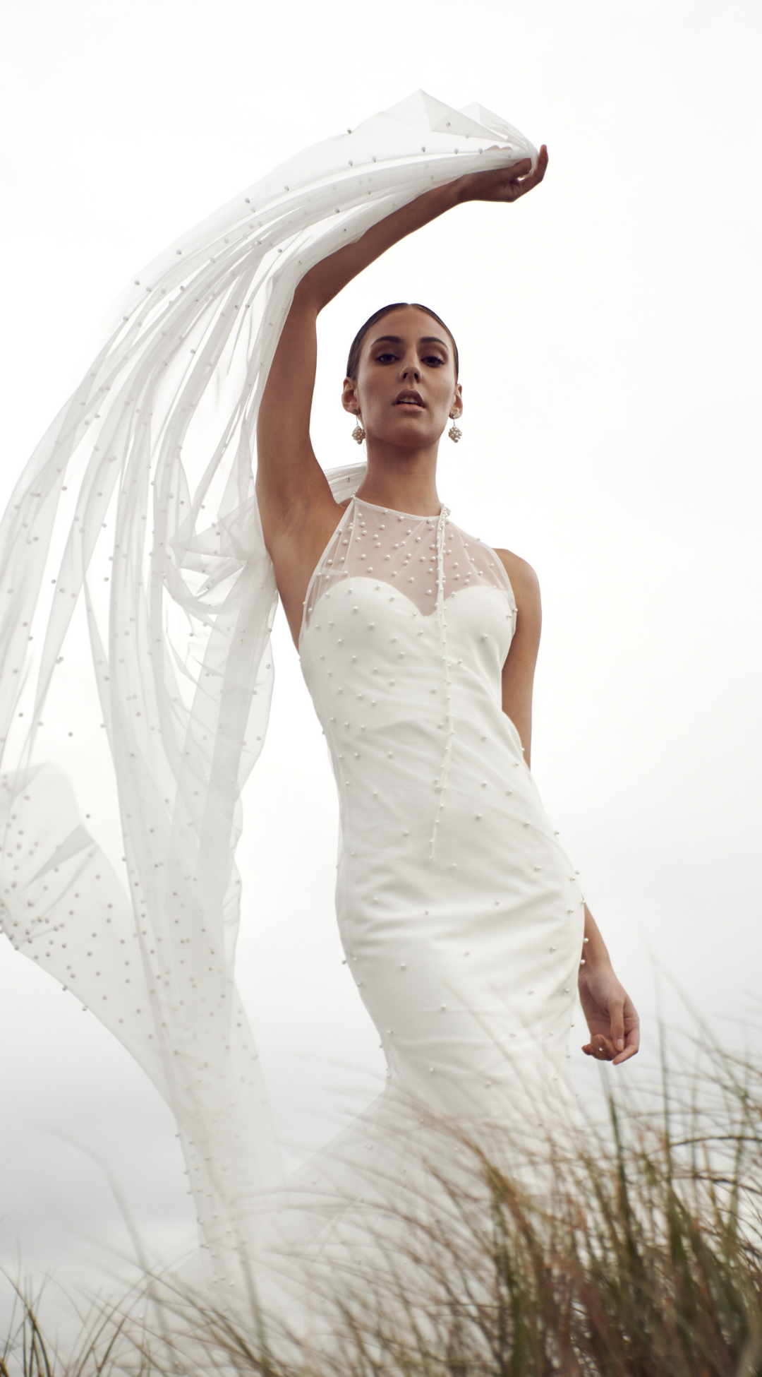 Our premium Italian tulle, used to create your veils, scarves and sleeves, is the most premium tulle available on the market. Delicately sheer yet remarkably strong, it's beautifully soft and falls with a graceful drape that flatters every silhouette. The perfect Ivory tone complements a wide range of wedding gown colours, never too white, never too yellow. You can glide a pin across the surface without tearing or snagging. Unlike lower-grade tulles, it doesn’t disintegrate or lose structure over time, ensuring your piece remains as pristine and timeless as the day it was made. The tulle drops creases easily when steamed, making this fabric practical for travel and all wedding-day wear.