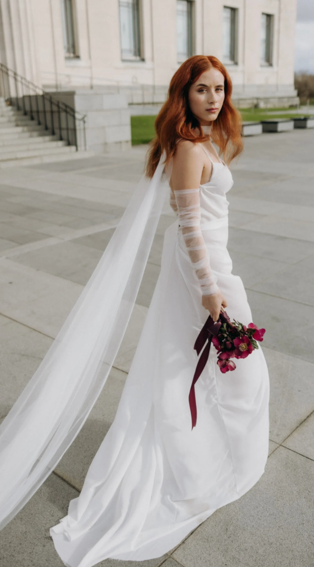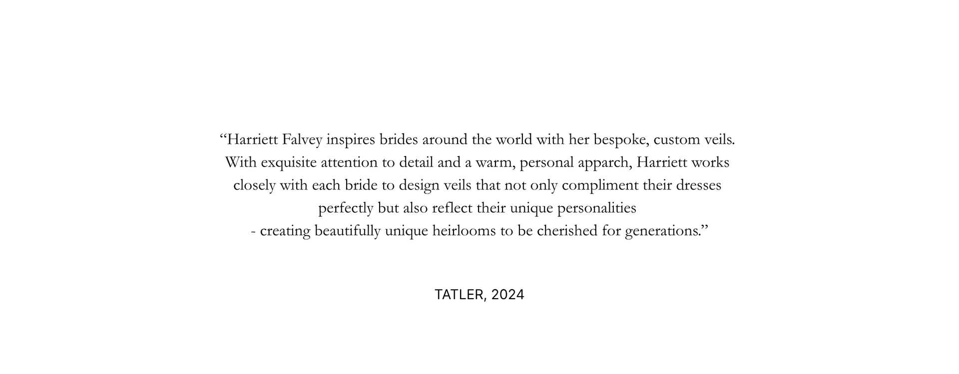 Each Harriett Falvey bridal piece can be custom dyed to complement your wedding attire perfectly. Simply send a photo of your dress, and Harriett will personally colour-match the fabric to achieve a seamless tone to match your wedding gown. Every shade is mixed by hand in the studio, ensuring the final hue feels soft, natural, and perfectly balanced, never too warm or too cool. This bespoke process allows your veil, scarf or sleeves to feel like an effortless extension of your dress, crafted with the same artistry and attention to detail that defines every Harriett Falvey design.