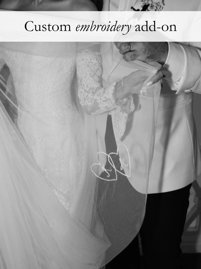 Our Custom Embroidery Add-On allows you to personalise your bridal accessory with hand-stitched initials, words, hearts or a special date.