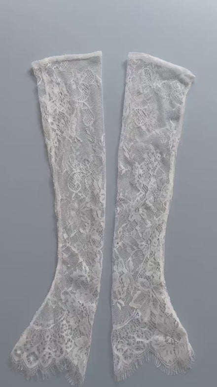Our Floral Chantilly Lace Gloves are crafted from delicate Ivory floral Chantilly lace, featuring intricate, fine flower details that feel light and feminine. The straight-edge bicep finish creates a clean, contemporary silhouette, while the soft lace naturally contours along the arm for an elegant, almost weightless look that flares out over your hand. Perfect for brides who want subtle floral detail without overwhelming their gown.