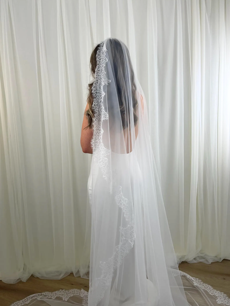 Our Peony Lace Extra Wide Veil is crafted with an ultra-full 300cm width, creating the most luxurious, sweeping drape. Made from soft Italian tulle and finished with a detailed peony lace edge, it frames the face with floral scalloping and delivers a breathtaking, cinematic silhouette - perfect for brides wanting that extra-wide, statement look. Available in a range of custom lengths and designed to complement many bridal styles, as seen on our real brides featured.